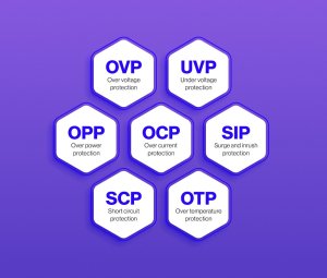 Ochrany: OVP (ochrana proti přepětí) UVP (ochrana proti podpětí) OCP (ochrana proti nadproudu) SCP (ochrana proti zkratu) OPP (ochrana proti přetížení) SIP (ochrana proti nárazovému proudu) OTP (ochrana proti přehřátí)