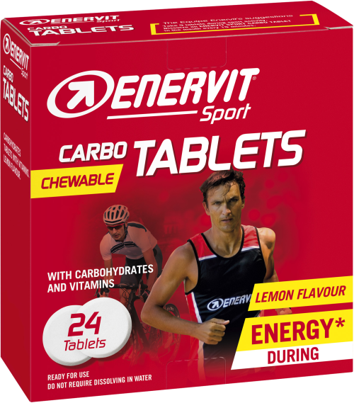 Energetické tablety Enervit Carbo Tablets (dříve Enervit GT Sport) jsou připravené tak, abyste je mohli mít vždy u sebe k okamžitému použití. Mají vysoký obsah více druhů sacharidů pro rychlé zažehnání nastupující únavy i pro průběžné doplňování energie. Účinky energetických tablet Energetické tablety pro okamžité doplnění rychle vstřebatelné energie (maltodextrin, dextróza) a potlačení únavy z nedostatku energie při sportu. Fruktóza zajistí průběžné a postupné doplňování energie. Doplněny o vitaminy skupiny B a sodík. Vitaminy B (B1, B2, B3 a B5) přispívají ke snížení míry únavy a vyčerpání a ke správnému energetickému metabolismu. Snadná manipulace během výkonu, jsou lehce rozpustné v ústech. Přednost Nezaberou moc místa, při sportu nepřekáží, ale zato odvedou výbornou službu doplněním energie i protikřečových minerálů. Doporučené dávkování: Kdy a jak použít Během námahy je možné konzumovat od 6 do 14 kusů energetických tablet, v závislosti od intenzity a délky trvání sportovního výkonu. Tabletu vždy důkladně rozkousejte a poté zapijte nápojem. Energetické tablety obsahují protikřečové minerální látky. Jsou určené k přímo konzumaci. Doba nástupu účinku je okamžitá, doba účinku 1 tablety je 20 minut. Tabulka nutričních hodnot: