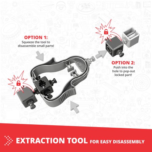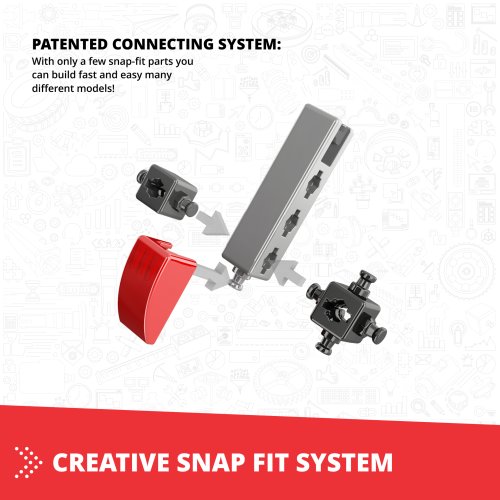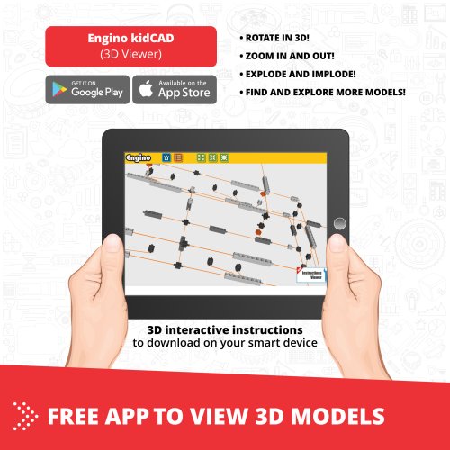 možnost sestavit 2 modely, stavebnice umožňuje: 1. level sestavení modelu, 2. level vymalování papírových dílů, 3. level experimentování, 4. level učení se, aplikace Engino kidCAD zobrazující 3D model