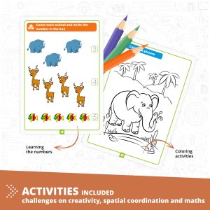 možnost sestavit 5 modelů, zajímavá fakta o zvířátkách, omalovánky, spojování teček a obkreslování čísel a písmen abecedy, aktivity k procvičování matematiky, tvarů a barev, aplikace Augmented Reality