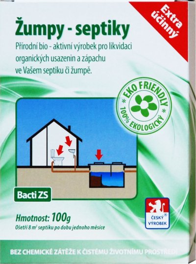 Bacti ZS je prostředek pro žumpy a septiky. Působením této směsi bakterií a enzymů dochází ke zkapalnění pevného organického odpadu, které se změní v nezapáchající kapalinu. Kapalinu lze pak odčerpat a použít pro zálivku trávy mimo záhony a dešťovou kanalizaci. Pokud má septik přepad, kapalina odteče.