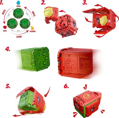 Vyzvěte soupeře na souboj! Zábavná hra Kámen, nůžky, papír s vašimi oblíbenými hrdiny ve formě bojových kostek. Vyberte si bojovou kostku, se kterou chcete hrát. Poté si na své bojové kostce zvolte kámen, nůžky nebo papír a svou volbu skryjte maskou vybraného hrdiny. Hoďte bojové kostky proti sobě a zjistěte, kdo se stane vítězem bitvy. Pamatujte, že kámen vždy porazí nůžky, ale ne papír. Jakou strategii zvolíte? Součástí balení jsou 2 kostky a 6 žetonů (4 obyčejné a 2 vzácné). Bojujte s kamarády o vítězství a vyměňujte si žetony a posbírejte všech 24 dílků. Variantu dodáváme dle skladových zásob.
