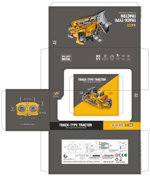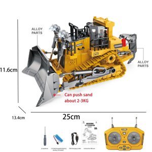 RC buldozer s pásovými koly je skvělý model pro všechny nadšence do dálkově ovládaných stavebních strojů Tento buldozer se pohybuje ve všech směrech – dopředu, dozadu, doleva a doprava Realistické zvukové a světelné efekty Přední světla svítí a model nabízí několik funkcí pro zábavu - „One click demo" pro předváděcí mód, zvukové efekty