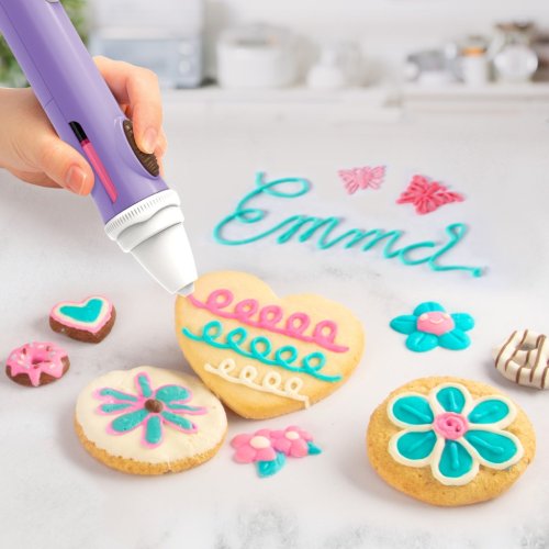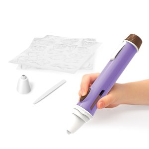 ČokoPero je kreativní sada určená pro děti od 6 let, která umožňuje originálním způsobem zdobit sladké dobroty pomocí čokolády. Tento produkt je ideální pro rozvoj fantazie a jemné motoriky, protože děti mohou psát, kreslit a vytvářet různé tvary z čokolády. Pero má ergonomický design v pastelové fialové barvě s hnědým uzávěrem, který připomíná čokoládovou bonboniéru, a je vybaveno tlačítkem pro snadné dávkování čokolády. Pro použití je potřeba vložit 2 baterie AAA, které nejsou součástí balení.