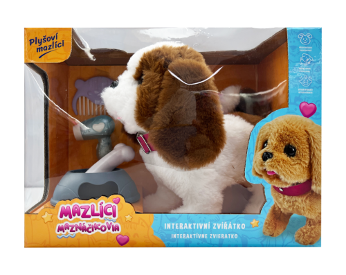 Mazlíci jsou zvířátka, která pomáhají rozvíjet představivost a dětskou interakci Mazli se se svým plyšovým mazlíkem, starej se a pečuj o něj Balení obsahuje hnědobílého pejska, hřebínek, mističku na jídlo a kostičku