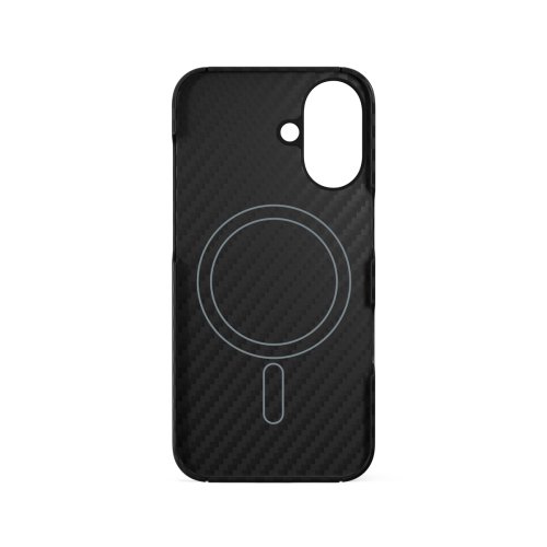 Kryt na telefon, pro Apple iPhone 16 Plus, kompatibilní s MagSafe, materiál aramidové vlákno, hliníkový rámeček kolem objektivů, barva černá.