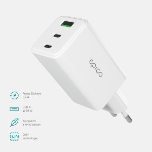 Nabíječka do sítě - s podporou rychlého nabíjení, celkový výkon 65 W (1× USB-C až 65 W, 1x USB-C až 20 W, 1x USB-A až 18 W), technologie Power Delivery, technologie GaN.