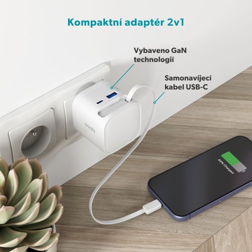 Vestavěný USB-C kabel, port USB-C a USB-A umožňují nabíjet až tři zařízení zároveň. Technologie GaN zajišťuje vysokou účinnost a menší zahřívání pro pohodlné každodenní používání. Díky kompaktnímu a lehkému designu se skvěle hodí na cesty, do kanceláře i na domácí použití. O bezpečnost se starají vestavěné bezpečnostní prvky, které chrání proti zkratu, přepětí, přetížení a přehřátí, takže máte vždy jistotu bezrizikového nabíjení