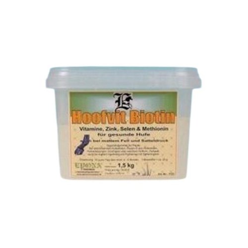 (Hoofvit Biotin) Biotin, zinek, selen a vitamíny pro zdravá kopyta. Speciální krmný doplněk pro koně sestavený na základě z dextrozy, kukuřičné a mrkvové moučky s DL-methioninem. Výborný při podpůrné léčbě slabé kopytní stěny a prasklinách, při poranění kopyta, pro zlepšení stavu kopytní rohoviny. Má velmi dobrý vliv na kvalitu srsti a v neposlední řadě pomáhá při problémech s otlaky. Složení: 25% dextrozy, 15% extrud.kukuřičné moučky, 10,0% mrkvového prášku, 10,0 % DL-methioninu. Obsahuje: 16,3 % dusíkatých látek, 0,7 % hrubé vlákniny, 4,5 % popela, 0,5 % tuku, 10 % methioninu. Doplňkové látky na 1 kg: 2.000.000 mcg biotinu, 1.000.000 I.E. vitamin A, 2.000 mg vitamin B6, 15.000 mg zinku, 40 mg selenu Doporučená krmná dávka: 10 g denně (alespoň po dobu 4-5 měsíců)