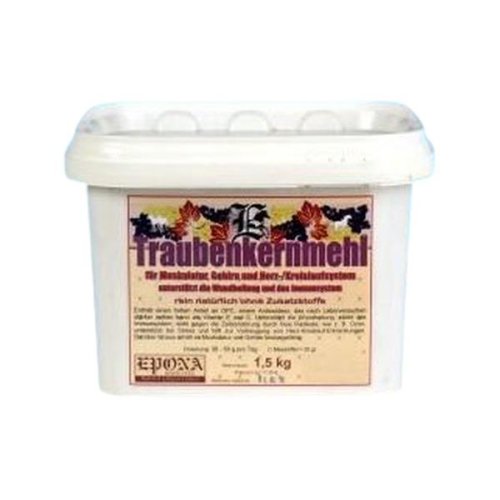 Moučka z hroznových jader Speciální krmný doplněk pro koně vyrobený ze 100% sušených hroznových jader, podporuje imunitní systém, hojení ran, krevní oběh a srdce, potlačuje stres. Obsahuje vysoký podíl OPC = oligomerický proanthocyanidin, jenž patří do skupiny přírodních antioxidantů, které chrání tělesné buňky před poškozením volnými radikály. OPC je v současnosti nejsilnější ze všech známých antioxidantů, je 18x účinnější než vitamín C a 40x účinnější než vitamín E. Vzhledem ke svému složení je jednou z několika málo látek, které mohou působit přímo na krev, mozek i míchu - pronikají všemi typy buněčných membrán a mohou uplatňovat antioxidační ochranu ve všech tkáních. Výtažek z hroznových jader napomáhá léčbě cévních poruch, posiluje slabé vlásečnice a zvyšuje průtok krve především končetinami, chrání zrak před poškozením - příznivě působí i na krevní oběh v očích, zmenšuje rizika rakoviny a srdečních onemocnění, snižuje možnost poškození kolagenu v kůži, pomáhá při jeho uchování a zesílení. Zklidňuje alergické projevy, blokuje uvolňování chemických látek účastnících se alergických reakcí, bolestivých stavů a zánětů. Odstraňuje edémy a otoky, rozpouští sraženiny, zpomaluje celkové stárnutí organismu, výrazně zlepšuje mozkové a svalové funkce. Je vyrobená bez konzervačních látek v certifikované BIO kvalitě. Analytické složky: