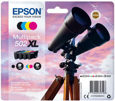 Technologie Obsah: 1 x 9,2 ml Černá, 1 x 6,4 ml Azurová, 1 x 6,4 ml Žlutá, 1 x 6,4 ml Purpurová Výtěžnost stran: 550 s (černá), 470 s (barvy) Kapacita: Vysoká Zkratka: 502XL Symbol: Dalekohled Velikost: XL