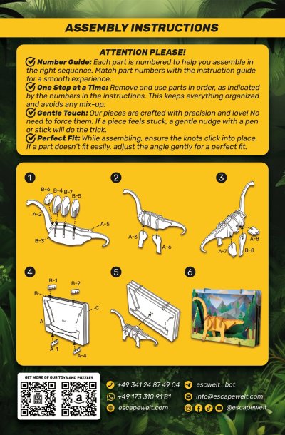 3D puzzle Brontosaurus je pro děti zábavné a zároveň výzvou pro rozvoj jejich prostorové představivosti a logického myšlení. Rozvíjí se zároveň také jemná motorika. Toto dřevěné 3D puzzle obsahuje 19 dílků, které musí být správně složeny dohromady, aby vytvořily podobu Brontosaura, oblíbeného dinosaura. Jednotlivé díly z dřevěné překližky jednoduše vymáčknete a dle přiloženého návodu krok za krokem skládáte různé modely - dřevěné hračky. Puzzle nemusíte lepit lepidlem, pak je lze kdykoliv rozložit a znovu složit. Doporučujeme si proto ponechat návod ke stavbě. Barevné dřevěné 3D puzzle jsou opatřeny kvalitním potiskem. Tyto dřevěné hračky jsou určeny dětem od 8 let a splňují všechny normy EU. Upozornění: Není vhodné pro děti do 3 let, protože obsahuje malé součásti – hrozí nebezpečí udušení. Balicí materiál není hračka. Hlavní vlastnosti: přírodní dřevěné 3D puzzlerozvíjí jemnou motoriku a představivostvhodné od 8 letjednoduchá obtížnost