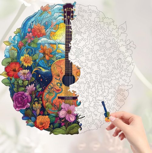 Puzzle s obrázkem kytary v květinách je unikátní dřevěné skládací puzzle, které spojuje kvalitní řemeslné zpracování s ekologicky odpovědným přístupem. Je vyrobeno z 5 mm FSC® certifikovaného dřeva, které zaručuje, že při výrobě byly dodrženy nejvyšší standardy ve správě lesů, což přispívá k udržitelnosti a ochraně biodiverzity. Každý z jedinečných 200 dílků skládačky je precizně vyřezán laserem, což zajišťuje dokonalou přesnost a hladkost hran, čímž usnadňuje skládání i manipulaci s dílky. Barevný a detailní obraz je reprodukován pomocí moderní technologie UV digitálního tisku, což přináší realistické a živé barvy do každého kousku skládačky. Toto puzzle je výzva pro všechny milovníky skládaček, kterým poskytne hodiny zábavy. Je také dobrou příležitostí, jak dát dohromady celou rodinu a přátele. Složený obrázek může sloužit jako krásný a dekorativní doplněk pro Váš prostor. Balení obsahuje: 200 dílků puzzle, úložný box, fólii na podlepení, samolepky pro montáž na zeď, návod. Hlavní vlastnosti: obsahuje 200 jedinečných dílkůUV digitální potiskprémiová kvalita puzzle 100% FSC® dřevodílky precizně vyřezány laseremrozvíjí logické myšlení a motorikusoučástí balení fólie na podlepení puzzleunikátní tvary a design