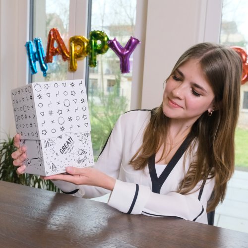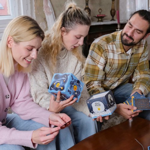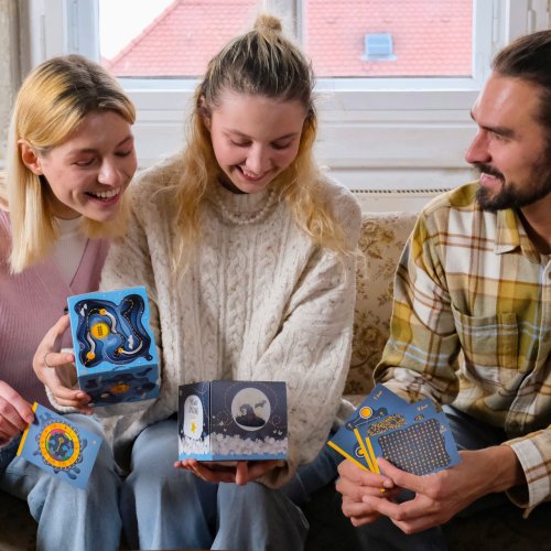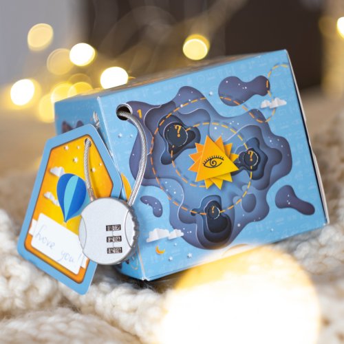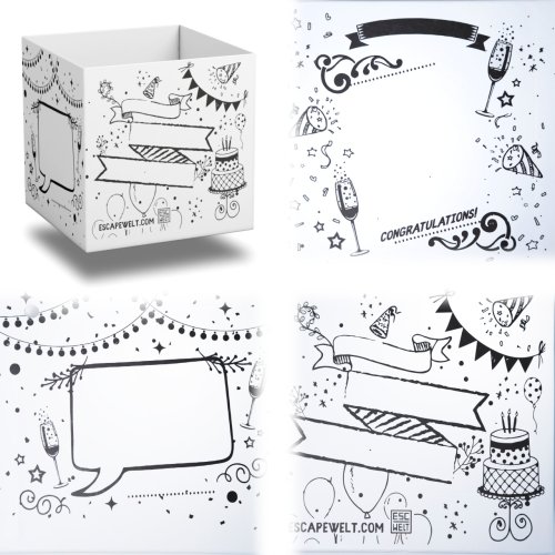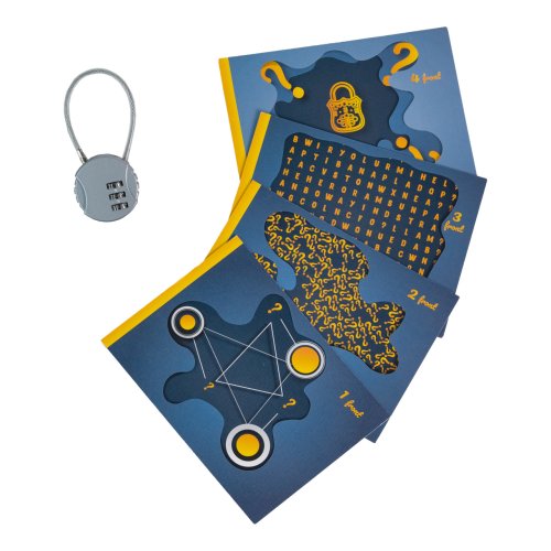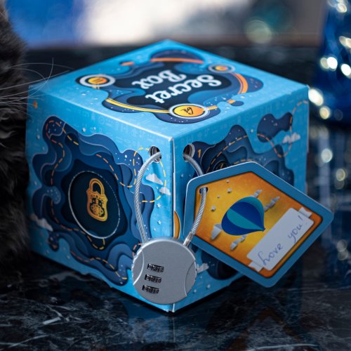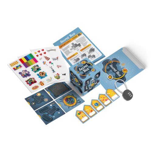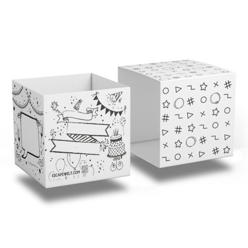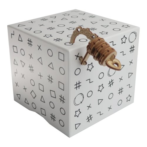 Hledáte originální balení na malý dárek? Spojte překvapení se zkouškou důmyslu a trpělivosti! Detailně potištěnou krabičku lze jednoduše sestavit a uzamknout zámkem s třímístným číselným kódem, který sami zvolíte. Vodítka k řešení krok za krokem snadno zaklíčujete na čtveřici karet vkládaných do kapes ve stěnách hlavolamu. Podrobný návod k uzamknutí a sestavení nápovědy najdete v popisu níže. V balení spolu s krabičkou a zámkem naleznete pestrou paletu dekoračních samolepek a popisovatelných visaček, pomocí kterých můžete dárek doplnit a ozvláštnit podle příležitosti, nebo osobnosti obdarovaného. Vybaveno ilustrovaným návodem k použití v anglickém a německém jazyce. Hlavní vlastnosti:skládačka krabičky, číselný zámek, 4 karty nápovědy, 3 archy dekoračních samolepek a 5 visaček s různými motivyrozměry vnitřní přihrádky 11,5×11,5×10,5 cmstřední obtížnostvyrobeno v EU OTEVŘÍT POSTUP UZAMKNUTÍ A SESTAVENÍ NÁPOVĚDY: Zvolte třímístné číslo, kterým uzamknete zámek. Při volbě dbejte na to, aby se žádná číslice v kódu neopakovala. Na kartě klíče pak k jednotlivým číslům naleznete odpovídající barvu, symbol a relativní směr, ve kterém se na klíči nachází. Možností je hned několik v závislosti na tom, jak obtížné chcete řešení udělat, nebo jaké jsou Vaše oblíbené barvy. Pro ilustraci je zvolena kombinace 918, kde za 9 v tomto případě platí žlutá/spirála/nahoře, za 1 fialová/oko/vpravo a za 8 světle zelená/sova/nahoře. Na první kartu nápovědy nalepte odpovídající symboly v příslušném pořadí, a to ve směru čárkované spirály vycházející ze středu stěny krabičky. Do největšího kroužku je v našem příkladu nalepena ikona spirály (za číslici 9), následně symbol oka (za číslici 1) do kroužku o střední velikosti, až po ikonu sovy (za číslo 8) do nejmenšího kroužku. Druhou kartu nápovědy opatřete samolepkami barev příslušných jednotlivým číslům kódu. Stejně jako v předchozím případě se orientujte podle velikosti natištěného kroužku, největší pro první číslici, nejmenší pro poslední. Třetí karta po vložení do kapsy ve stěně hlavolamu odhalí ve výřezech několik různých označení směru. Po jejím vyjmutí označte samolepkou s příslušnou barvou směr, který odpovídající číslice na klíči relativně zaujímá. Řešitele zde také můžete zmást umístěním nálepek jiných barev na nevyužitá místa vyznačená na kartě. Zámek lze ve výchozím stavu otevřít nastavením kombinace 000. Poté můžete stisknutím a podržením tlačítka vespod nastavit nový číslený kód. Jakmile spodní tlačítko uvolníte, bude k odemčení zapotřebí aktuálně nastavená kombinace.