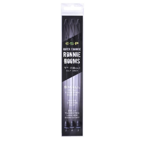 Návazce ESP Quick Change Ronnie Boom jsou dostupné v barvách Weedy Green, Camo Brown a Silt Grey, aby odpovídaly různým podmínkám na dně. Můžete si vybrat mezi gramáží wolframové objímky 0,3 g a 0,6 g, což umožňuje použití s různými velikostmi háčků a plovoucími nástrahami.