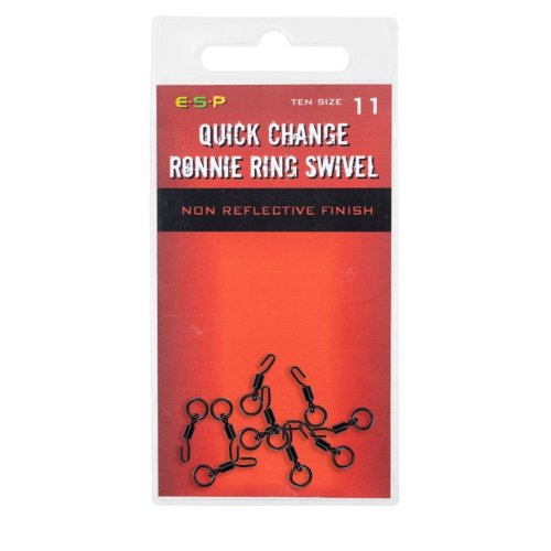 ESP QC Ronnie Ring Swivel ESP QC Ronnie Ring Swivel jsou obratlíky s kroužkem, speciálně navržené pro použití na populární montáž Ronnie Rig. Tento typ obratlíku umožňuje rychlou a snadnou výměnu háčku přímo v terénu, což ocení každý rybář. Pro optimální spojení mezi obratlíkem a háčkem doporučujeme použít smršťovací hadičku ESP Shrink Tube 1,6 mm. Nastavením úhlu háčku pomocí této hadičky dosáhnete perfektní prezentace nástrahy. Návazec se připevňuje přímo ke kroužku, který vytváří nezbytný kloub a tím zlepšuje prezentaci nástrahy. Matné černé provedení obratlíků minimalizuje odlesky a zvyšuje tak šanci na úspěch. Balení obsahuje 10 kusů.