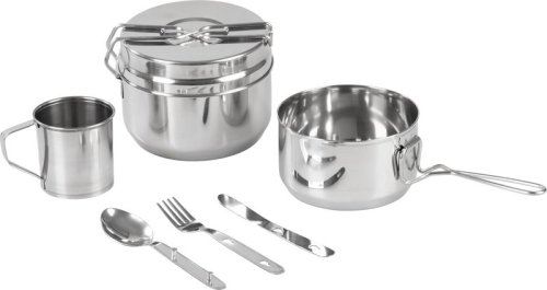 Praktická kempinková souprava Strend Pro je ideálním společníkem na výlety do přírody, stanování, turistiku nebo jako výbava do zahrady. Sada obsahuje nezbytné komponenty pro přípravu a konzumaci jídel, vyrobené z odolné nerezavějící oceli (INOX), což zaručuje dlouhou životnost a snadné čištění. Sada obsahuje: 1x hrnec průměr 13 cm s rukojetí, 1x pánev průměr 15 cm s rukojetí (možnost použít jako poklici), 1x kovový hrnek s ouškem, 1x příbor – lžíce, vidlička, nůž, 1x pouzdro pro pohodlné uložení. Vhodné pro 1 osobu. EAN 8584163101085