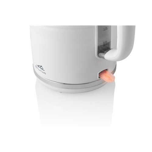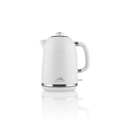 Plastová varná konvice ETA Duna. Příkon 2200 W a objem 1,7 l. Skryté topné těleso pod rovným nerezovým dnem.