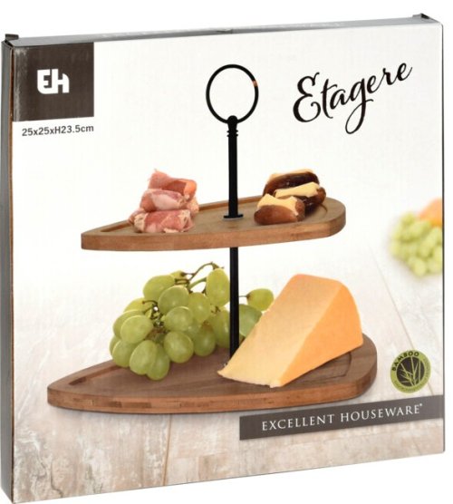 Dřevěný etažér umožňuje servírování a prezentaci sladkých i slaných pochoutek až na dvou patrech, což Vám ušetří místo na jídelním stole. Velmi často se používá etažér na cukroví, ale můžete na něm servírovat ovoce, jednohubky, předkrmy, sušenky, makronky i zákusky. Etažér je vyrobený z bambusového dřeva, které je odolné a zároveň ekologické. Díky bambusu je etažér lehký a snadno přenosný, takže ho můžete snadno přemístit z jednoho místa na druhé.