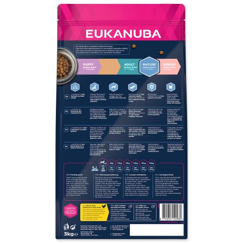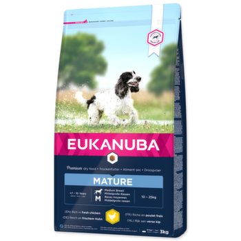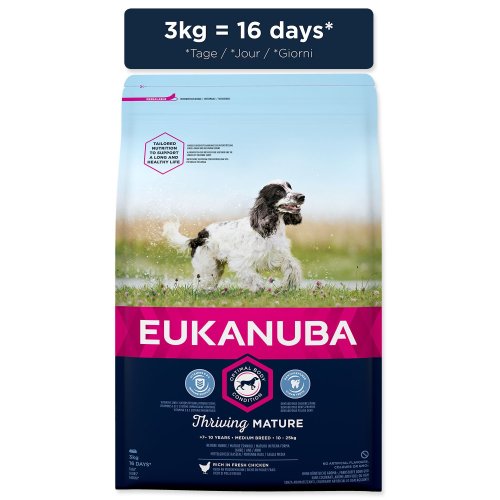 Nová EUKANUBA vylepšená receptura se zaměřením na konkrétní fázi života - pro starší psy středně velkých plemen od 7 do 10 let – poskytuje na míru upravenou výživu pro zdravé stárnutí vašeho staršího psa. Naše jedinečná na míru upravená receptura pro středně velké starší psy obsahuje směs vlákniny, prebiotika FOS a řepné dužiny pro podporu zdravého zažívání, vápník pro zdravé kosti, glukosamin pro zdravé klouby, přirozený zdroj mastných kyselin omega-6 a omega-3 pro zdravou kůži a srst, L-karnitin, který pomáhá s udržením ideální váhy a antioxidanty, vitamin E a C pro podporu imunitního systému. Naše unikátní granule ve tvaru šestiúhelníku s přídavkem DentaDefense také pomáhají s udržováním čistých a zdravých zubů. Pokročilá výživa pro středně velké starší psy se zaměřením na podporu optimálního tělesného stavu a celoživotní pohodu.