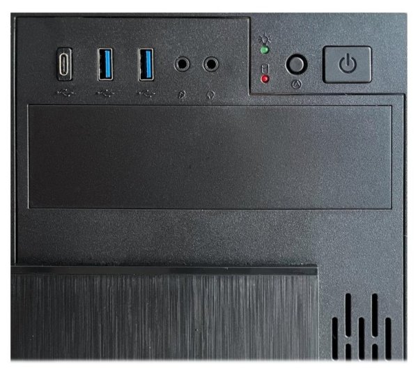 Konektory na předním panelu: 2× USB 3.0, 1× USB-C, 1× sluchátkový výstup, 1× vstup pro mikrofon