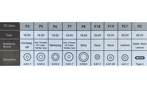 Balení obsahuje koncovky P4 až P36 s různými rozměry a výstupními napětími. Koncovka P4 (4,8 × 1,7 mm) poskytuje 18,5 V pro Compaq a HP, zatímco nejběžnější P5 (5,5 × 2,5 mm) dodává 19 V pro širokou škálu značek.