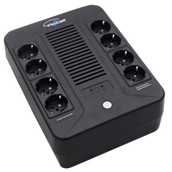 Záložní zdroj kompaktní velikosti, přizpůsobený i k zavěšení na stěnu. Na čelním panelu nalezneme vypínač ON/OFF a indikační LED.