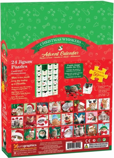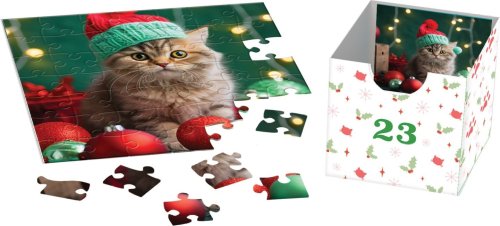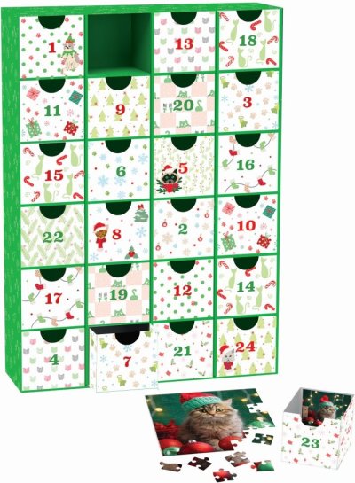 kalendář obsahuje 24 různých puzzle obrázků s motivem vánočních psů, každé puzzle má 50 dílků, obrázky mají čtvercový tvar a rozměr jednoho puzzle je 12,5 x 12,5 cm, kalendář obsahuje 24 šuplíků a je znovu použitelný (pro příští rok si s jeho pomocí můžete vytvořit originální adventní kalendář naplněný drobnostmi nebo něčím sladkým), rozměr přihrádky je cca 6,5 x 6 x 7,5 cm, vzadu v každém šuplíku je vyobrazená předloha skládaného obrázku.