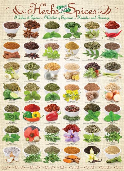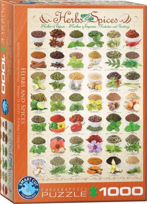 Puzzle EUROGRAPHICS s obrázky mnoha druhů bylinek a koření. Texty na puzzle jsou uvedeny v angličtině. Na zadní straně krabičky je v anglickém jazyce uveden recept.