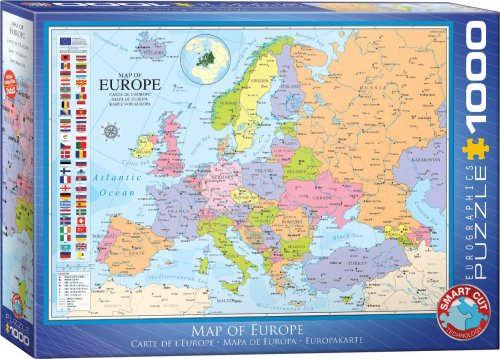 Puzzle Mapa Evropy je výzvou pro každého milovníka puzzle. Na své si přijdou i příznivci zeměpisu a kartografie. Na mapě jsou barevně odlišeny jednotlivé státy. Mimo jiné jsou zde vyznačena i hlavní a větší města všech vyobrazených zemí spolu s popisem moří a oceánů.