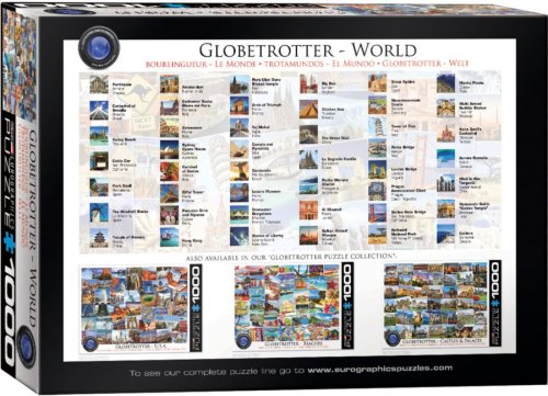 Puzzle EUROGRAPHICS z kolekce Globetrotter Collection (Světoběžník). Více než 40 nejznámějších míst celého světa s podrobným popisem na zadní straně krabičky (v angličtině).