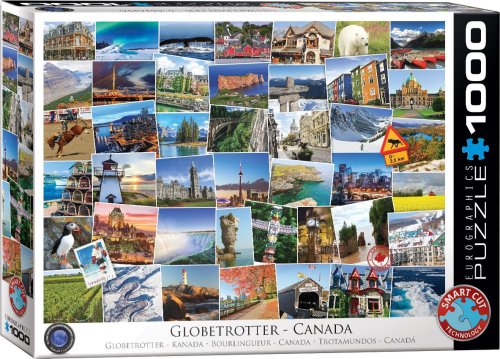 Puzzle EUROGRAPHICS z kolekce Globetrotter Collection (Světoběžník) s popisem na zadní straně krabičky (v angličtině). Více než 40 obrázků typických pro zemi javorového listu - Kanadu.