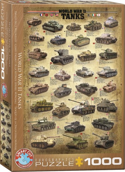 Puzzle představuje tanky 2. světové války. U každého tanku je uvedeno jeho jméno, země původu, typ, jak dlouho byl v provozu, hmotnost, délka, šířka, výška, ale také rychlost na silnici nebo kolika člennou posádku mohl tank mít. Raznice puzzle EUROGRAPHICS nekopíruje standardní mřížku, rohy a hrany dílků nejsou vždy v jedné ose a dílky mají neobvyklý tvar. Obtížnost puzzle je tak vyšší než u klasické mřížkové raznice, kterou používají přední výrobci v Evropě. Rozměr složeného puzzle cca 48,89 x 67,63 cm