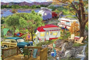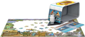 Puzzle v plechové krabičce ve tvaru karavanu .