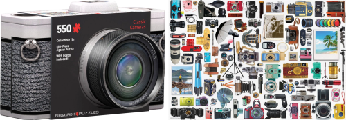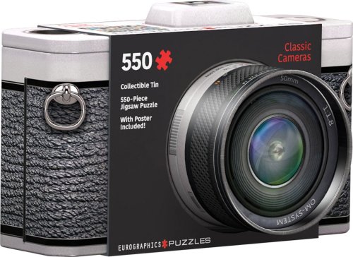 Puzzle v plechové krabičce ve tvaru stříbročerného klasického fotoaparátu. Sběratelská kolekce potěší všechny milovníky plechových krabiček s potiskem a obal na puzzle se tak stává zajímavou a nevšední dekorací. Horní část fotoaparátu tvoří víko krabičky a je odnímatelná. Součástí balení je i samostatná předloha s motivem pro skládání. Dílky mají speciální tvar (nekopírují klasickou puzzle raznici). Rozměr složeného puzzle cca 48 x 33 cm