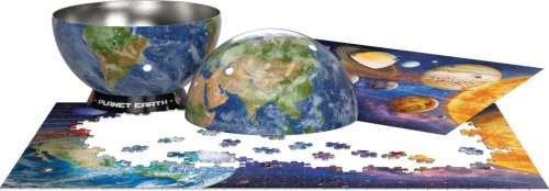Puzzle v plechové krabičce ve tvaru planety Země. Rozměr složeného puzzle cca 48 x 33 cm