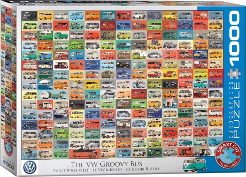Puzzle VW Groovy Bus je koláž fotografií německých aut značky Volkswagen. Mezi obrázky nechybí ani bus ozdobený kytkami, přece jen tento model proslavily nejvíce právě květinové děti (hippies).