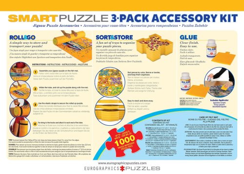 Sada pro všechny puzzle příznivce, díky roztřídíte, poskládáte puzzle a nakonec jej pohodlně slepíte. Speciální balení od kanadského výrobce Eurographics obsahuje: rolovací podložku vhodnou pro tisícidílkové puzzle většiny světových výrobců, 6 praktických plastových podnosů (nádob) o rozměru 20 x 20 cm ve tvaru puzzle dílků, lepidlo na puzzle s objemem 100 ml (vhodné pro slepení cca 2.000 dílků) a plastovou stěrkou. Podložka pod puzzle v netradiční žluté barvě s úchytem přes rameno je vhodná pro 1.000 dílkové puzzle většiny výrobců, ideální pro úsporu místa a bezpečné uchování nedokončeného i hotového obrázku, vhodná pro transport puzzle. Údržba filcové podložky: Podložku lze žehlit na nejnižší teplotu nejlépe přes tenkou tkaninu (utěrku). Ruční praní ve studené vodě, neždímat a nesušit v sušičce. UPOZORNĚNÍ: V případě zakoupení koberečku pro skládání puzzle jiných značek doporučujeme ověřit rozměry složeného puzzle. Výhody plastového třídiče s kapacitou 1.000 dílků: - přehledné třídění puzzle dle tvaru nebo barev - po skládání lze přihrádky jednoduše naskládat na sebe (stohovat) - třídič i s dílky lze uložit zpět do krabice, zabírají méně místa a dílky se neztratí Tekuté lepidlo na puzzle s objemem 100ml pro trvalé slepení cca 2.000 dílků. Má praktické použití (nanáší se přímo na obrázek, lepidlo zateče do spár mezi dílky). Po aplikaci nechejte lepidlo řádně minimálně 1 hodinu zaschnout! Návod na použití: Ochraňte svůj pracovní prostor (např. pomocí novin nebo igelitem) a přesuňte na něj poskládané puzzle. Nalejte lepidlo na puzzle a pomocí aplikátoru rozetřete lepidlo po celém povrchu (vyplňte všechny mezery). Nechejte schnout nejméně 1 hodinu. Pro pevnější slepení můžete po zaschnutí nanést vrstvu lepidla i z druhé strany složeného puzzle. Po použití umyjte aplikátor v horké vodě pro další použití.