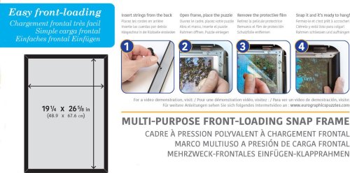 vhodné pro jakékoliv puzzle o rozměru 48,89 x 67,63 cm (např. Eurographics 1000 dílků, Eurographics XL 500 dílků, Eurographics XL 300 dílků ) lze zavěsit na výšku i na šířku snadné rámování z přední strany klaprámu ochrana obrázku je zajištěna pevnou folií stylový design s ostrými rohy lze využít také na fotografie, plakáty, dokumenty, obrázky patřičného rozměru