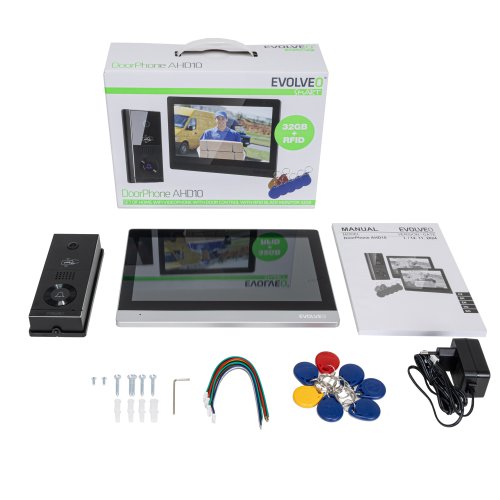 Domovní znovek EVOLVEO DoorPhone AHD10, Sada domácího WiFi videotelefonu s ovládáním dveří a RFID, černo stříbrný 10" monitor, 32GB