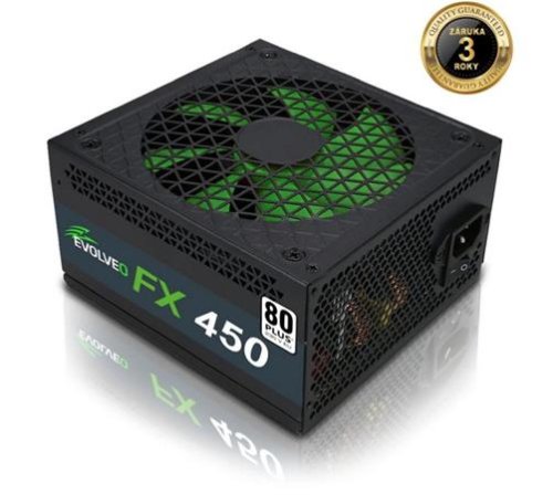 EVOLVEO FX 450, zdroj 450W, 80+ White, ATX 2.2, 1× PCIe, aPFC, tichý 140mm ventilátor, 4x SATA, bulk, záruka 3 roky, černý