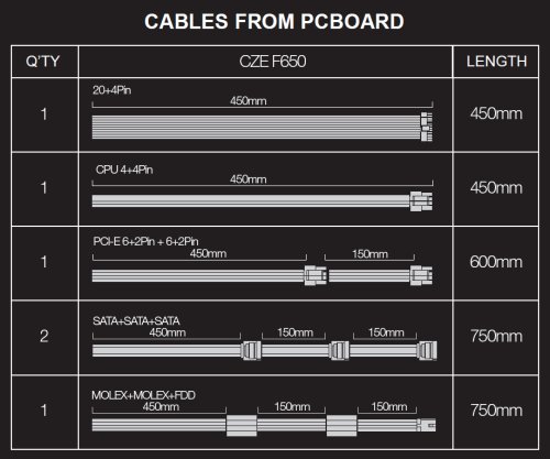 Kabeláž • 20+4 Pin (450mm) • CPU 4+4 pin (450mm) • PCI-E (6+2) +(6+2)pin (450+150mm) • Sata+Sata+Sata (450+150+150mm) • Sata+Sata+Sata (450+150+150mm) • Molex+Molex+FDD (450+150+150mm) • černá barva