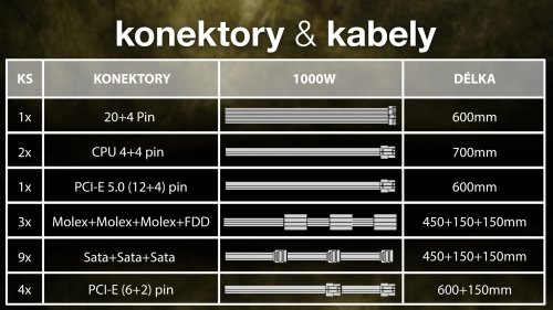Zdroj EVOLVEO G1000 je ideální volba pro herní počítač, který má osazenou grafickou kartu s rozhraním PCIe 5.0. Vyjímá se především účinností s certifikací 80 PLUS GOLD zaručující účinnost až 90%. Zdroj je plně modulární, z toho důvodu je možné připojit jen nejnutnější kabely. Součástí je i tichý 140mm ventilátor. Vzhledem k velkému výkonu nemá tento zdroj semi-pasivní chlazení. Ventilátor zdroje je v stále v provozu a jeho otáčky jsou regulovány v závislosti na potřebě chlazení