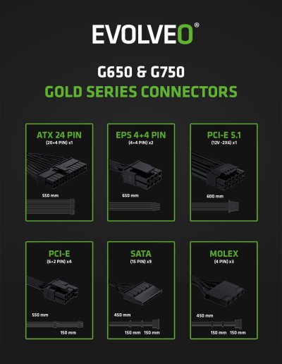 EVOLVEO G650 zdroj 650W, 80+ GOLD, ATX 3.1, aPFC, 140 mm ventilátor