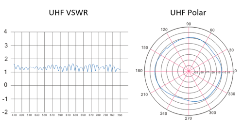 UHF VSWR graf zobrazuje účinnost antény v pásmu UHF. Koeficient rovný 1 znamená přeměnu všech elektromagnetických vln na elektrický signál. S grafem UHF Polar je možné pozorovat oblasti prostoru antény s nejlepším ziskem. Anténa Jade 3 je všesměrová, znamená to tedy možný příjem ve všech směrech.