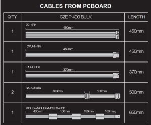 Specifikace • CE certifikace, norma RoHs • tichý 12 cm větrák s regulací otáček • kabeláž v délce 40 cm • 1x napájecí kabel pro MB 20+4pin • 1x napájecí kabel s 3x MOLEX konektorem a 1x fd3 • 1x napájecí kabel cpu 8pin - 4+4 • 2x napájecí kabel s 2x S-ATA konektorem • 1x napájecí kabel VGA PCI-E 6pin