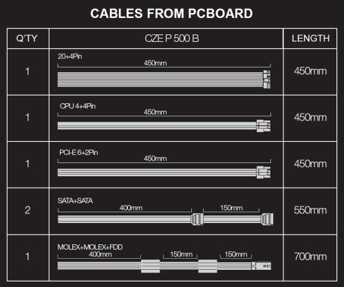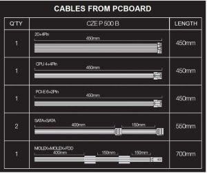 Specifikace • CE certifikace, norma RoHs • tichý 12 cm větrák s regulací otáček • kabeláž v délce 40 cm • 1x napájecí kabel pro MB 20+4pin • 1x napájecí kabel s 2x MOLEX konektorem a 1x fd3 • 1x napájecí kabel cpu 4pin (8pin - 4+4) • 2x napájecí kabel s 2x S-ATA konektorem • 1x napájecí kabel VGA PCI-E 6+2pin
