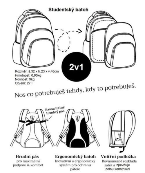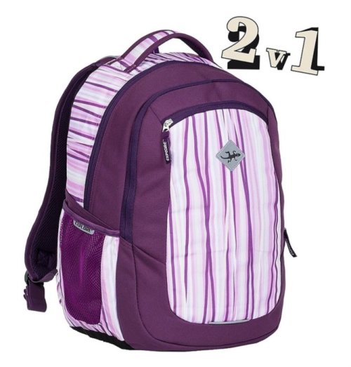 Studentský batoh 2v1 VIKY je dvoudílný a tříkomorový. Dvoudílný (2v1) znamená, že zip u prostřední komory jde buď úplně rozepnout a tím se rozdělí batoh na dva. Nebo se rozepne jen částečně a slouží jako plnohodnotný tříkomorový batoh. Větší batoh má zádovou část s polstrováním a ergonomickým systémem pro ochranu páteře. Široké nosné řemeny jsou opatřeny výškově nastavitelným spojovacím prsním páskem. Dno batohu má vnitřní podložku, která zpevní jeho celkovou konstrukci a zajistí stabilitu batohu při jeho postavení na zem. Na předním dílu je pak velká kapsa na zip. Menší batoh, má organizér našitý na velké vnitřní kapse. Organizér tvoří kapsička na mobil, kapsička na zip a místo na psací potřeby. V horní části je upevněna karabinka na klíče. Na předním dílu batohu je kapsička na zip. Zádová část je polstrována v celé ploše. Batoh má dvě síťované volně přístupné boční kapsy v horním okraji se všitou gumou. Reflexní prvky jsou jak na předním dílu, tak i na nosných řemenech.