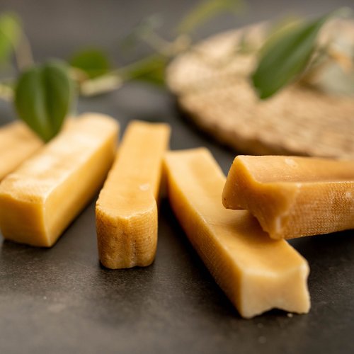 Dentální tyčinky ze sýra s jahodami jsou tvrdé, zdravé a přirozené pamlsky pro psy, které podporují dentální hygienu a pomáhají odstraňovat zubní kámen. Tyto přírodní sýrové pamlsky jsou lehce stravitelné, neobsahují laktózu, lepek ani konzervační látky. Díky svému složení a tvrdosti jsou ideální pro každého psa, bez ohledu na věk, velikost nebo plemeno. Himálajské sýry, ze kterých jsou tyto pamlsky vyrobeny, pocházejí z mléka volně chovaných himálajských krav. Proces výroby začíná hodinovým vařením mléka, aby se odstranil veškerý tuk a zajistila se pasterizace. Potom se přidává trocha soli a limetkové šťávy (celkem jen 0,01 %) ke srážení. Následuje lisování sýra po dobu 2-3 dnů, aby se odstranila vlhkost. Bloky sýra jsou pak nakrájeny na přiměřeně velké kusy a sušeny v udírně po dobu 20-30 dnů, což jim dodává tvrdost a jemnou, kouřovou chuť.