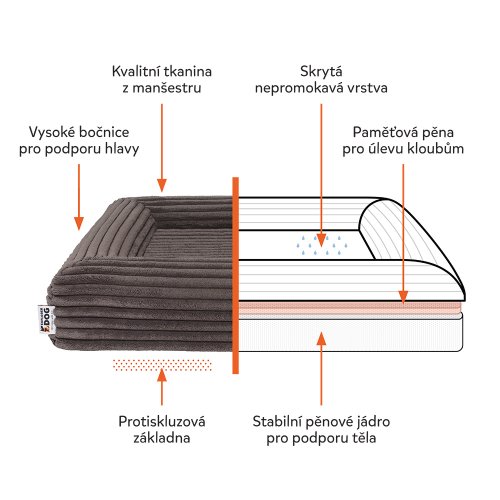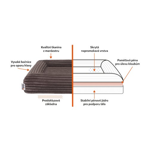 Použité materiály splňují nejpřísnější standardy na kvalitu a bezpečnost. Potah z hebkého manšestru má certifikaci OEKO-TEX Standard 100, která zaručuje, že neobsahuje žádné škodlivé látky. Manšestr je vyrobený ze 100% polyesteru, na rozdíl od bavlny nevsakuje snadno vodu, rychleji schne a je více odolný proti zápachu. Samotná ortopedická matrace je vyrobena z pěn certifikovaných podle CertiPUR-US, tedy bez formaldehydu, těžkých kovů a dalších škodlivých látek. Díky odolným zipům YKK lze potah snadno sejmout a vyprat v pračce, což zajišťuje nejen hygienu, ale i dlouhodobou udržitelnost celého pelechu.